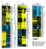 A) Genes that depend statistically significantly on both CBF1 and MET31/MET32, and contain a TFBM for Cbf1p (gray dot under column "C") and/or Met31p/Met32p (green dot under column "M"). Strain order for both panels is met6Δ, cbf1Δmet6Δ, met31Δmet32Δmet6Δ, met4Δ. B) Selected genes that depend statistically significantly on CBF1 and MET31/MET32 and lack a TFBM.